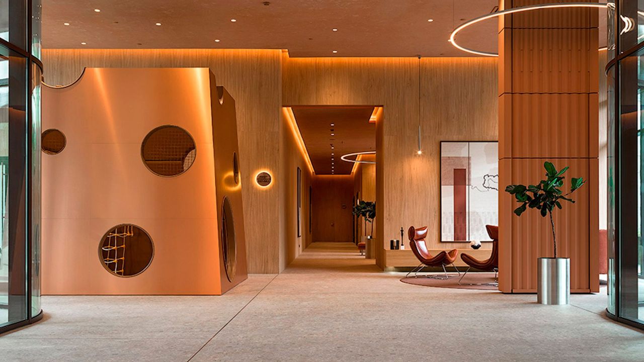 ЖК Eniteo - камерный проект, расположенный в двух монолитных башнях высотой 42 этажа, объединенных стилобатом, блестящий экстерьер которых выполнен с сочетанием металла латунных оттенков и стекла, подчеркивающих воздушный характер и оригинальность геометрии. А МОПы здания спроектированы архбюро HAAST, известными создателями современных и эргономичных общественных пространств. Всего в комплексе насчитывается 662 просторные квартиры с современными европейскими планировками с высотой потолков до 3.32 м. На 39 этаже располагаются террасы с захватывающими видами.