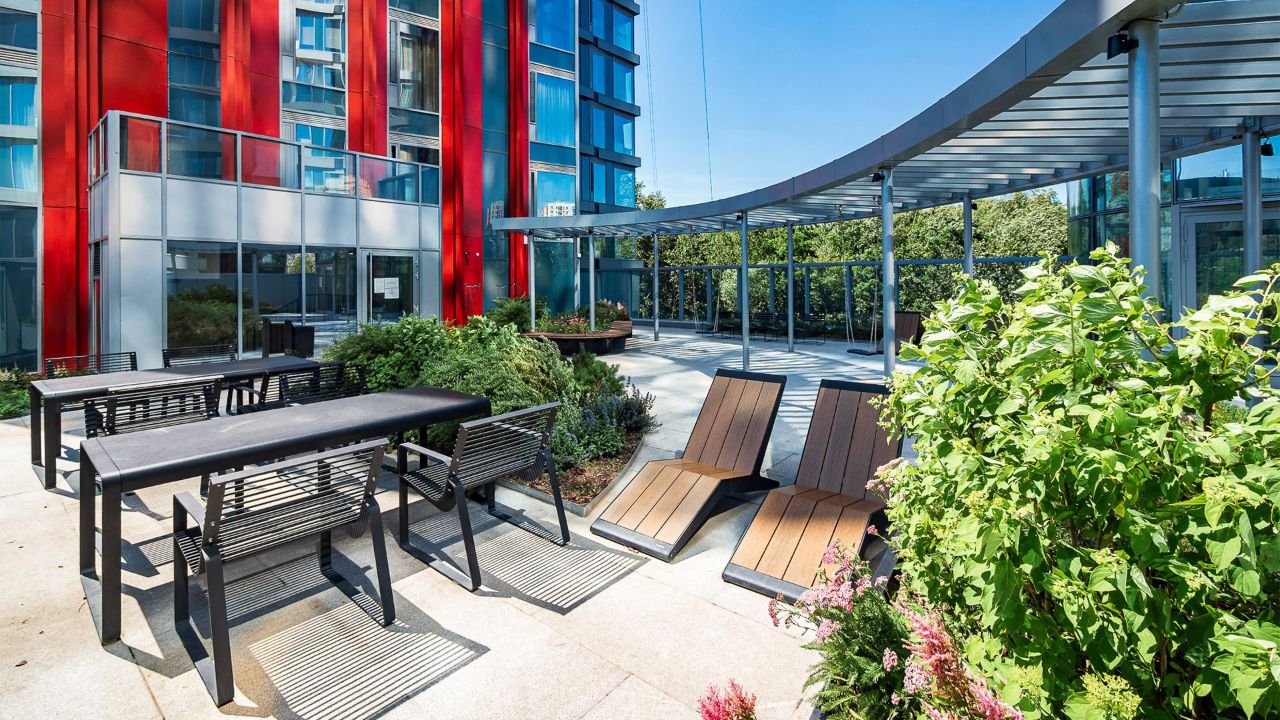 Благоустройству в новом комплексе отведено особое значение. Так, помимо общего озеленения двора, тут находится второй уровень благоустройства на эксплуатируемой крыше стилобата. Рисунок мощения во дворе повторяет линии на фасадах башен, плавно переходя с одной плоскости на другую.